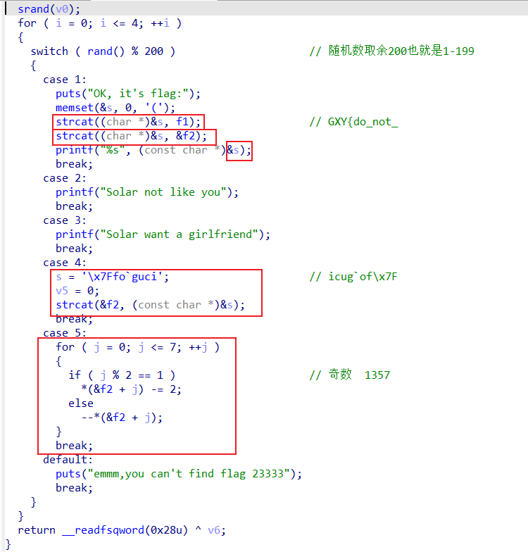 输出的是s,而s是由f1和f2位置存储的信息构成的,f1直接点进去就是注释的内容,f2则根据下面的case4,5有关f2的操作来确定内容。f2先是被case4存进内容,而此处\x7F是代表这是16进制,所以逆序存进去之后为注释内容。case5对存进去的字符串进行了处理。