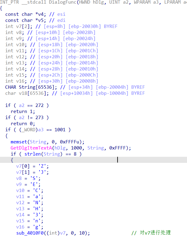 这里的v7->v16都是连续内存,后面存进了字符,然后sub_4010F0进行处理了,进去看一眼