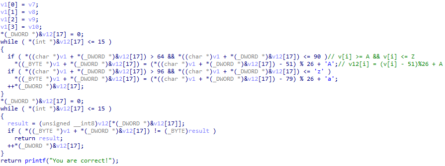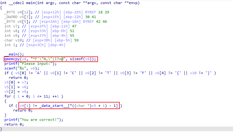 在循环中有一次校验,v4[i] != _data_start__[*((char *)v5 + i) - 1],反推可得v5:在_data_start__中对应v4[i]的元素的下标加一