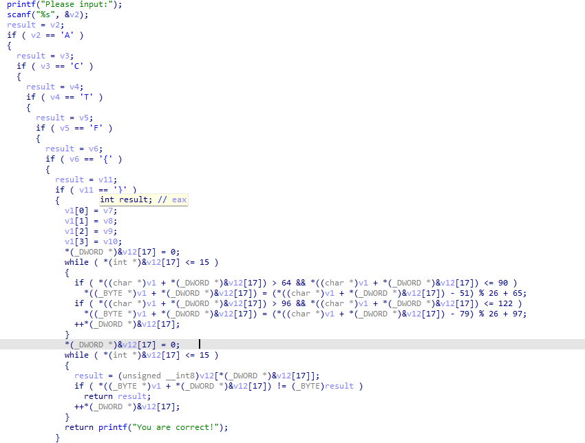 根据第一个if可以看见v6为ACTF{flag}的格式,也就是v5数组那部分为flag,接着分析v5友v7v8v9未知数赋值